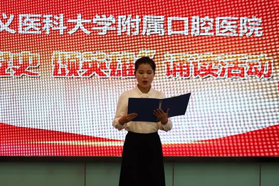 活动中,口腔医学院党委书记葛颂为活动致辞。随后,各个党支部以集体诵读、个人领读、小组齐读等方式进行,大家积极参与,诵读内容丰富。由修复科与种植科党支部带来《开往刑场的火车,赵一曼给7岁儿子留下了绝笔信》,牙体牙髓科带来《长征故事》······评比活动中,党员同志们声情并茂、情感真挚、富有感染力,一个个红色故事触动人心,使全体党员从红色经典中感受到了共产党人、革命先辈的民族节气和伟大精神。