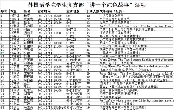 100年风雨兼程、100年披荆斩棘、100年砥砺奋进,讲好中国共产党的故事是基层党支部党史学习教育的重要一环。为庆祝中国共产党成立100周年,自4月12日,外国语学院学生中英文“微”宣讲活动拉开帷幕,活动将持续至五月。本次“微”宣讲采用线上、线下相结合,线下宣讲53场,覆盖四个年级四个专业13个班级,线下听讲学生达1308人次。故事题材涉及井冈山精神、长征精神、遵义会议精神、红岩精神、抗美援朝精神、“两弹一星”精神、抗洪精神、抗震救灾精神、抗疫精神、脱贫攻坚精神……
