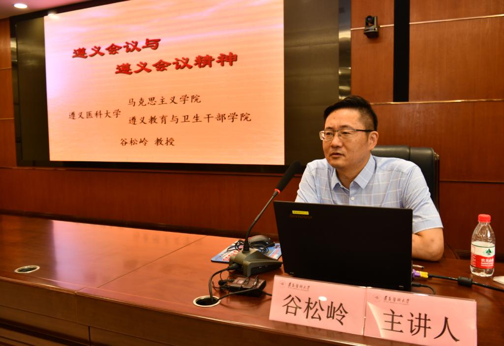 谷松岭教授对遵义会议在中共党史中的重要地位、遵义会议精神的丰富内涵进行讲解,并讲述了中央红军在遵义期间的医疗工作,介绍了中国工农红军卫生学校(中国医科大学前身)在遵义期间的办学经历。