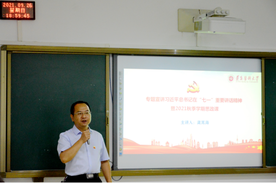 为深入贯彻落实习近平总书记“七一”重要讲话精神,深入推进贵州省“三全育人”综合改革试点院系工作,9月26日,学校党委委员、副校长龚其海为2019级临床药学1班的同学们上了一堂思政教育课。